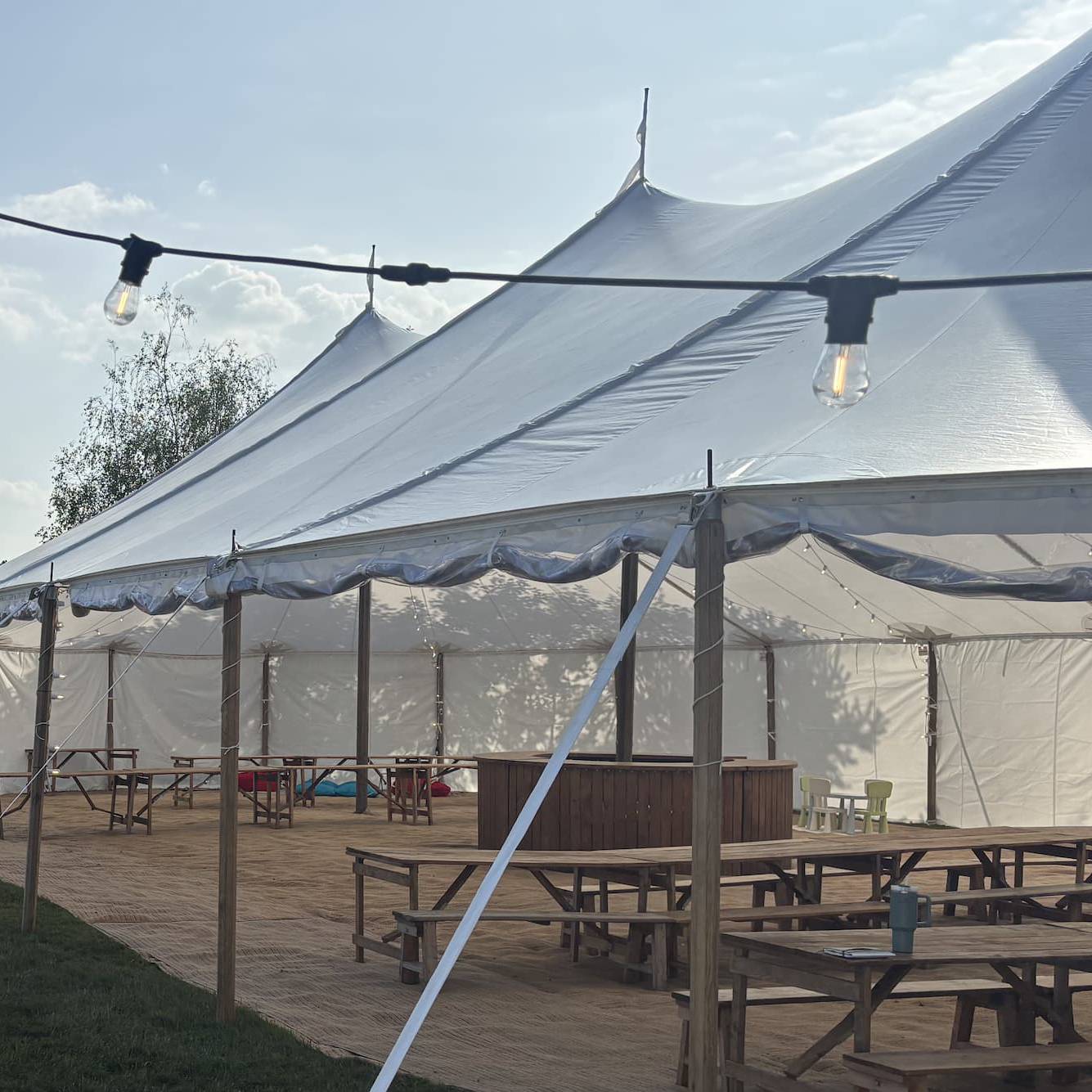 A weather-tight canvas combining elegance, durability and simplicity, is held aloft by solid milled spruce poles finished with a natural wood stain. Festive flags sit on top of the king poles and wave beautifully in a light breeze.